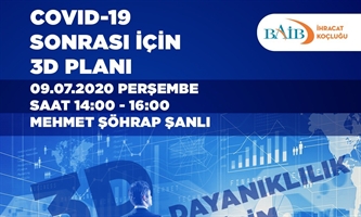 Bu kapsamda 9 Temmuz 2020 Perşembe günü 14.00-16.00 saatleri arasında Sayın Mehmet Ş. Şanlı tarafından ‘‘Covid-19 Sonrası İçin 3D Planı (Dayanıklılık, Değişim, Dönüşüm)'' konulu bir webinar gerçekleştirilecektir.