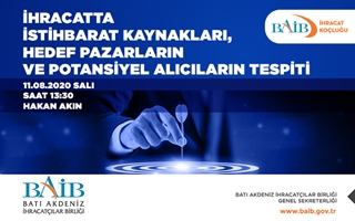 Bu kapsamda 11 Ağustos 2020 Salı günü 13:30'da Hakan Akın'ın anlatımıyla "İhracatta İstihbarat Kaynakları, Hedef Pazarların ve Potansiyel Alıcıların Tespiti Eğitimi” düzenlenecektir.