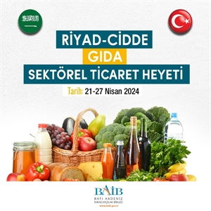 T.C. Ticaret Bakanlığı koordinasyonu ile 5973 sayılı İhracat Destekleri Hakkında Karar çerçevesinde, 20-26 Nisan 2024 tarihleri arasında Riyad-Cidde / Suudi Arabistan'a Gıda sektöründe faaliyet gösteren üyelerimize yönelik Sektörel Ticaret Heyeti gerçekleştirilmesi planlanmakta olup, Sektörel Ticaret Heyetine ilişkin taslak programımız ekte yer almaktadır.