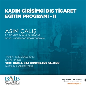 T.C. Ticaret Bakanlığı koordinasyonu, Batı Akdeniz İhracatçılar Birliği Genel Sekreterliği ve MUSİAD-Kadın Antalya Şubesi işbirliği ile "Kadın Girişimci Dış Ticaret Eğitim Programı-II” gerçekleştirilecektir.