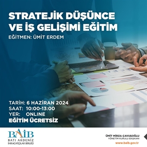 Batı Akdeniz İhracatçılar Birliği Genel Sekreterliği olarak"Stratejik Düşünce ve İş Gelişimi” eğitimi gerçekleştirilecektir.