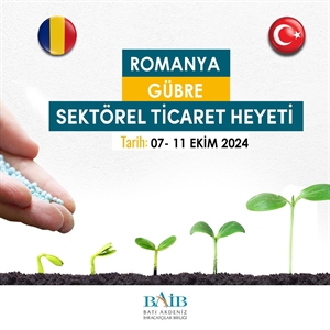 T.C. Ticaret Bakanlığı koordinasyonu ile 5973 sayılı İhracat Destekleri Hakkında Karar çerçevesinde,7 Ekim - 11 Ekim 2024 tarihlerinde Romanya'ya Gübresektöründe faaliyet gösteren firmalarımıza yönelik Sektörel Ticaret Heyeti gerçekleştirilmesi planlanmakta olup, Sektörel Ticaret Heyetine ilişkin taslak programımız ekte yer almaktadır.