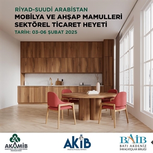 Batı Akdeniz İhracatçılar Birliği ve Akdeniz İhracatçı Birlikleri Genel Sekreterliği (AKİB) bünyesinde yer alan Akdeniz Mobilya, Kağıt ve Orman Ürünleri İhracatçıları Birliği (AKAMİB) ortaklığında, Ticaret Bakanlığından onay alınması durumunda, 03 - 06 Şubat 2025 tarihleri arasında Riyad - Suudi Arabistan'a Mobilya, Mobilya Aksesuarları, Mobilya Yan Sanayi Ürünleri, Kereste-Palet, Orman Tali Ürünleri, Ahşap Mamulleri sektörlerine yönelik Suudi Arabistan Sektörel Ticaret Heyeti düzenlenecektir.