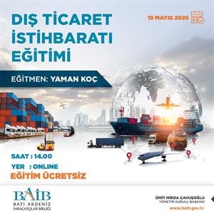 Batı Akdeniz İhracatçılar Birliği Genel Sekreterliği olarak " Dış Ticaret İstihbaratı” konulu bir eğitimi gerçekleştirilecektir.