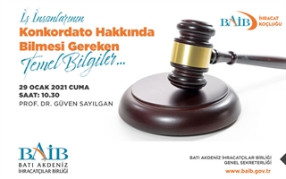 Video konferans yöntemi ile düzenlenecek online seminerimize tüm üyelerimiz davetli olup katılım ücretsizdir. "İş İnsanlarının Konkordato Bilmesi Gereken Temel Bilgiler” seminerine https://www.baib.gov.tr/canliyayin bağlantısı üzerinden ya da Batı Akdeniz İhracatçılar Birliği resmi Youtube kanalından belirtilen eğitim tarih ve saatinde katılım sağlanabilecektir.