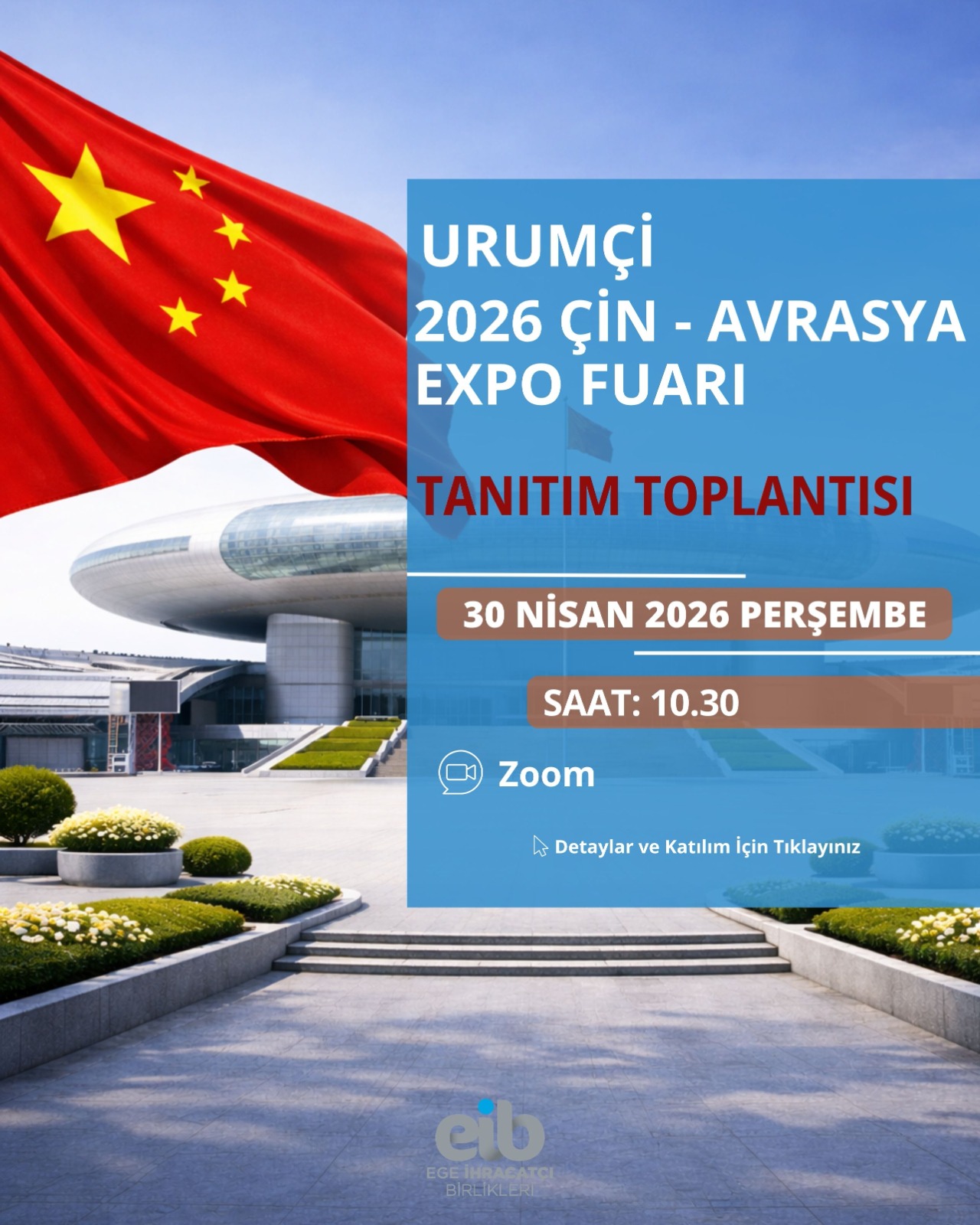 Ege İhracatçı Birlikleri(EİB)'nden alınan bir yazıda, Çin'in Sincan Uygur Özerk Bölgesinin başkenti Urumçi'de 25-29 Haziran 2026 tarihlerinde "2026 Çin Avrasya Expo Fuarı” düzenleneceği belirtilmektedir.
