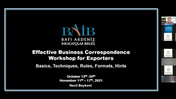 Batı Akdeniz İhracatçılar Birliği (BAİB) İhracat Koçluğu-2 Projesi kapsamında gerçekleştirilen eğitimler, aralıksız devam ediyor. Bu çerçevede ‘İhracatçılar İçin İngilizce İş Yazışmaları Atölyesi (1. Oturum) eğitimi gerçekleştirildi. Eğitimin 2. Oturumu 20 Ekim tarihinde gerçekleştirilecek.