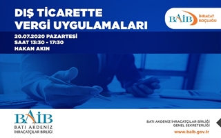 İhracatçılarımızın ihtiyaç duyabileceği ticari konular hakkında bilgilendirmelerde bulunmak ve ihracat sırasında yaşadığı sorunlarının çözümüne katkı sağlamak amacıyla yürütmekte olduğumuz "İhracat Koçluğu” projemiz kapsamında 20 Temmuz 2020 Pazartesi günü 13:30'da Hakan Akın'ın anlatımıyla "Dış Ticarette Vergi Uygulamaları Eğitimi” düzenlenecektir.