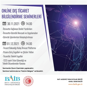 T.C. Ticaret Bakanlığı, Türkiye İhracatçılar Meclisi, Türkiye Odalar ve Borsalar Birliği ve Organize Sanayi Bölgeleri Üst Kuruluşu koordinasyonu; Antalya Ticaret Odası, Bucak Ticaret ve Sanayi Odası, Burdur Ticaret ve Sanayi Odası, Isparta Ticaret ve Sanayi Odası, Kumluca Ticaret ve Sanayi Odası, Manavgat Ticaret ve Sanayi Odası işbirliği ve Birliğimiz organizasyonu ile 30 Kasım 2021 ve 01 Aralık 2021 tarihlerinde online platformda "Dış Ticaret Bilgilendirme Seminerleri” düzenlenecektir.