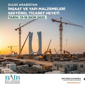 T.C. Ticaret Bakanlığı koordinasyonu ile 5973 sayılı İhracat Destekleri Hakkında Karar çerçevesinde, Birliğimiz ve Akdeniz Kimyevi Maddeler ve Mamulleri İhracatçıları Birliği tarafından, 13-16 Ekim 2025 tarihleri arasında Riyad/Suudi Arabistan'a İnşaat ve Yapıl Malzemeleri sektöründe faaliyet gösteren firmalarımıza yönelik Sektörel Ticaret Heyeti gerçekleştirilmesi planlanmaktadır.