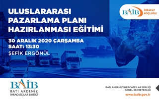 İhracatçılarımızın ihtiyaç duyabileceği ticari konular hakkında bilgilendirmelerde bulunmak ve ihracat sırasında yaşadığı sorunlarının çözümüne katkı sağlamak amacıyla yürütmekte olduğumuz "İhracat Koçluğu” projemiz kapsamında 30 Aralık 2020 Çarşamba saat 13.30'da Sayın Şefik Ergönül tarafından "Uluslararası Pazarlama Planı Hazırlanması” online eğitimi düzenlenecektir.