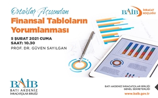 Video konferans yöntemi ile düzenlenecek online seminerimize tüm üyelerimiz davetli olup katılım ücretsizdir. Ortaklar Açısından Finansal Tabloların Yorumlanması eğitimine https://www.baib.gov.tr/canliyayin bağlantısı üzerinden ya da Batı Akdeniz İhracatçılar Birliği resmi Youtube kanalından belirtilen eğitim tarih ve saatinde katılım sağlanabilecektir.