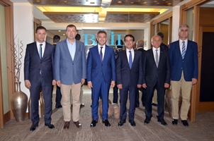 Antalya Ticaret Borsası (ATB) Yönetim Kurulu Başkanı Sayın Ali ÇANDIR, Yönetim Kurulu Başkan Yardımcısı Sayın Halil BÜLBÜL, Yönetim Kurulu Üyesi Sayın Hüseyin SİMAV ve ATB Genel Sekreteri Sayın Tolgahan ALAVANT, Batı Akdeniz İhracatçılar Birliği (BAİB) Yönetim Kurulu Başkanı Sayın Hakkı BAHAR'ı ziyaret etti. ATB, ziyaretinde BAİB Başkanı Sayın BAHAR'a, BAİB Başkan Yardımcısı Sayın Hakkı Ergin CİVAN'da eşlik etti. Seçim sonrası nezaket ziyaretinde bulunan ATB heyeti, BAİB Başkanı Sayın BAHAR ve Yönetim Kurulu Üyelerine başarı diledi.
