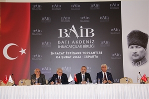 Batı Akdeniz İhracatçılar Birliği (BAİB) 2021 yılında 437 milyon dolar ihracat gerçekleştiren Isparta'da düzenlediği istişare toplantısında ihracatçılarla bir araya geldi. Toplantıda Isparta'nın ihracat verileri değerlendirilip, ihracatçıların yaşadığı sıkıntılar, karşılaştıkları sorunlar dile getirildi ve çözüm önerileri üzerine fikir alışverişinde bulunuldu. Toplantıda BAİB Başkanı Ümit Mirza Çavuşoğlu, Yönetim Kurulu Üyeleri Osman Şahlan, Mustafa Küçükyaman, Isparta Ticaret ve Sanayi Odası (ITSO) Başkanı Mustafa Tutar ve ihracatçılar katıldı.