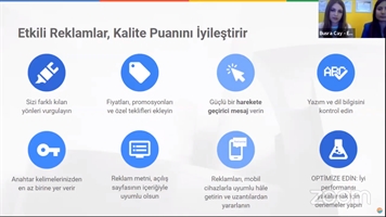 Eğitim kapsamında gerçekleştirilen sunumda firmalarımıza bilgi aktarımında bulunularak ‘Reklam Türleri, Etkili Reklamlar, Reklamların Gösterileceği Yerler ve Hedef Kitleleri, Sosyal Medya Reklamları' gibi konular üzerinde duruldu.