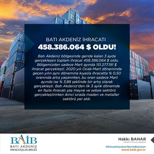 Batı Akdeniz bölgesinde geride kalan 3 ayda gerçekleşen toplam ihracat 458 milyon 386 bin 64 dolar oldu. Bölgemizden sadece Mart ayında 151 milyon 277 bin 191 dolar ihracat gerçekleşti. 2020 yılı Ocak-Mart döneminde geçen yılın aynı dönemine kıyasla ihracatta yüzde 0,50 oranında artış yaşanırken, bu oran sadece Mart ayında ise yüzde 3,88 şeklinde bir artış olarak gerçekleşti. Batı Akdeniz'den ilk 3 aylık dönemde en fazla ihracatı yaş meyve ve sebze sektörü gerçekleştirirken ikinci sırada maden ve metaller sektörü yer aldı.