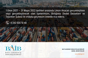 1 Ekim 2021 - 31 Mayıs 2022 tarihleri arasında Limon ihracatı gerçekleştiren veya gerçekleştirecek olan üyelerimizin, Birliğimiz Devlet Destekleri ve Teşvikler Şubesi ile irtibata geçmesini önemle rica ederiz.
